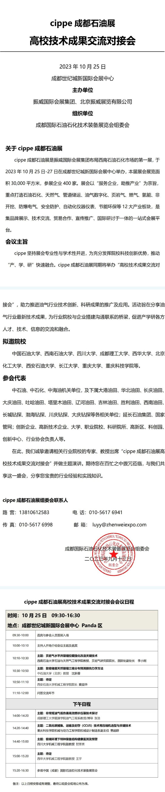 cippe堅持展會專業(yè)性與學術性并進,為充分發(fā)揮院??萍紕?chuàng)新優(yōu)勢,推動“產、學、研”快速融合。cippe成都石油展同期將舉辦“高校技術成果交流對接會”,助力推進油氣行業(yè)技術創(chuàng)新、科研成果的推廣及應用。活動旨在分享油氣行業(yè)最新技術成果,為行業(yè)院校與企業(yè)搭建溝通聯(lián)系的橋梁,促進產學研各方人才、技術、信息的交流和融合。
