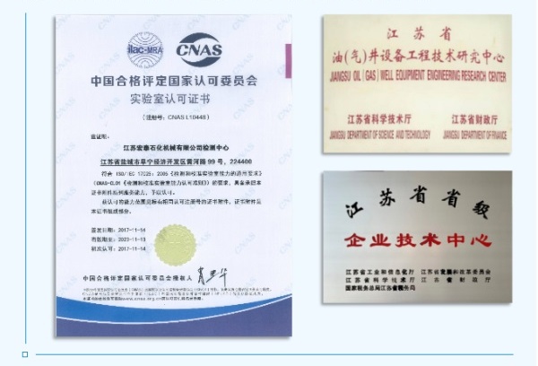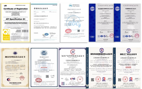 公司通過美國石油學會API Q1《質量管理綱要》、GB/T 19001-2016/ISO 9001質量管理體系認證、GB/T 24001-2016/ISO 14001環境管理體系認證、GB/T 45001-2020/ISO 45001職業健康安全管理體系認證、ISO 10012測量管理體系認證、GB/T29490知識產權管理體系認證、ISO3834焊接管理體系認證、GB/T27922售后服務認證、ISO/IEC17025實驗室認證、GB/T36231-2018《綠色工廠評價通則》、GB/T39257-2020《綠色制造制造型企業綠色供應鏈管理評價規范》等認證。