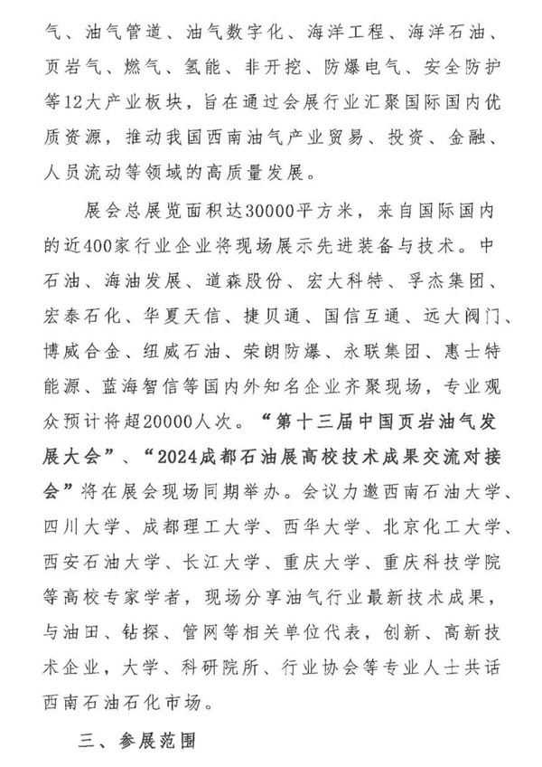本屆展會規劃展覽面積30000平方米,預計將吸引400余家行業企業攜新產品、新技術亮相現場,重點打造石油石化、天然氣、管道儲運、油氣數字化、頁巖氣、燃氣、氫能、非開挖、防爆電氣、安全防護、自動化儀器儀表、節能環保等12大產業板塊,展會同期舉辦“第十三屆中國頁巖油氣發展大會”、“cippe成都石油展油氣產業技術論壇”“展會直播”等精彩活動,是集品牌展示、技術交流貿易合作、先傳推廣、國際研討于一體的一站式會展平臺。