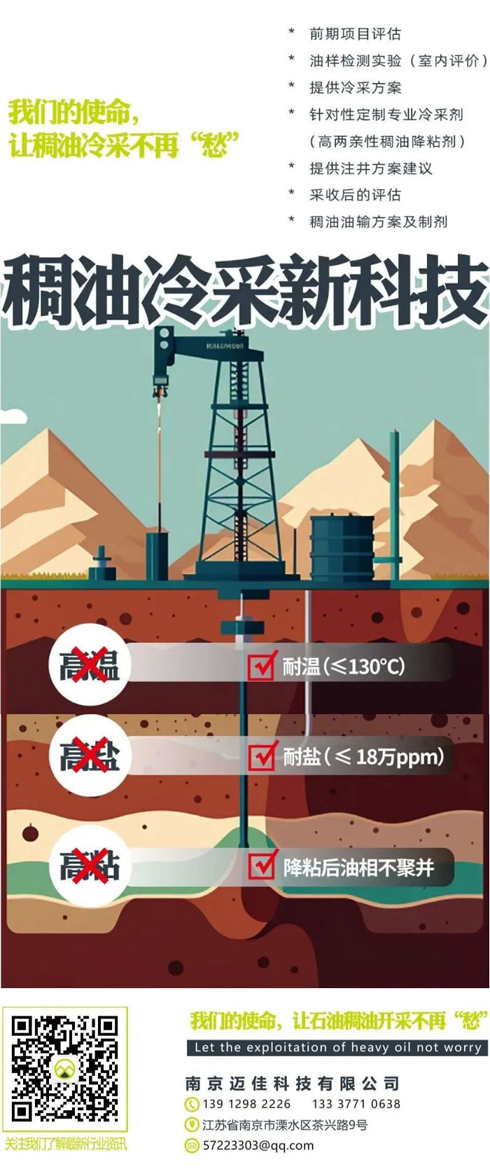 南京邁佳科技有限公司是一家專業從事石油稠油冷采注劑研究及工藝研發的專業機構,我公司吸取國際先進的石油開采技術,由行業內專家組成研發團隊與南京大學等專業研究院合作,具備多年的行業經驗及大量的技術數據積累。