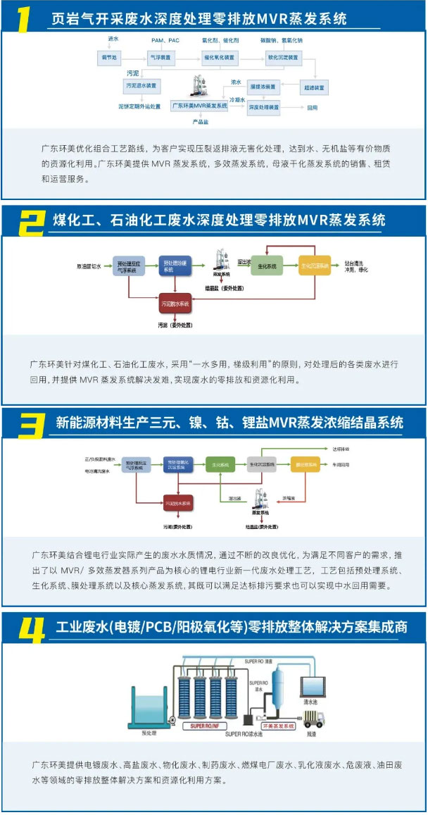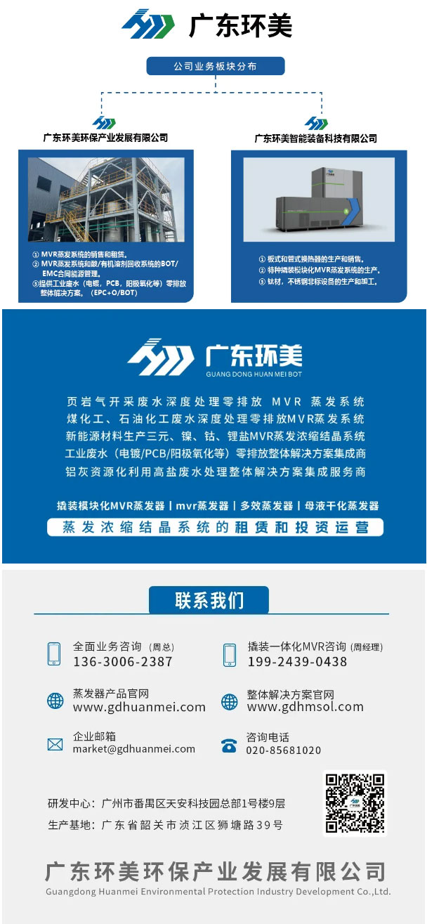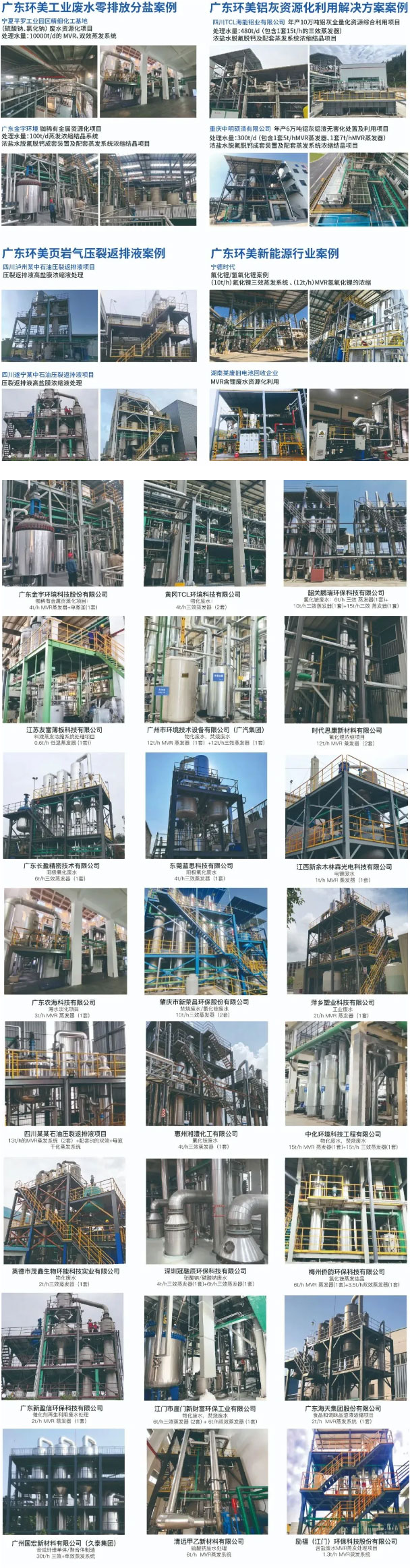 廣東環美以工業廢水零排放及廢物資源化核心裝備-蒸發系統為依托,圍繞電鍍及金屬表面處理行業、鋰電行業、鋁灰濕法處理、煤礦、煤化工、石油壓裂返排液行業等領域,為客戶在工業廢水處理領域提供一站式服務的零排放整體解決方案,并提供蒸發系統租賃和運營服務。