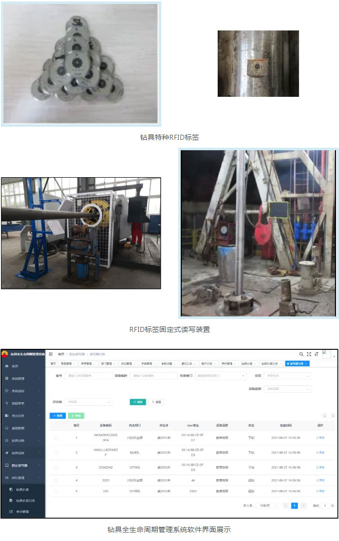 基于RFID標簽的鉆具全生命周期管理系統1、該系統包括鉆具RFID標簽、固定及手持標簽識別裝置、鉆具管理信息化軟件系統。鉆具RFID標簽作為電子身份證鑲嵌在鉆具單根上,固定及手持標簽識別裝置掃描識別鉆具RFID標簽,記錄對應鉆具服役數據,并將數據上傳到鉆具管理系統進行分析處理。2、該系統研制的鉆具RFID標簽具有體積小、耐高溫高壓、識別性能好等特點,可滿足200MPa高壓、200℃高溫環境下使用,井口識別準確率達98.5%以上,解決了鉆具單根智能識別的行業難題,實現了針對鉆具單根服役數據的信息化、智能化管理。3、該系統設計了檢維修及出入井使用等鉆具管理關鍵環節的RFID標簽自動識別裝置,實現了鉆具單根的自動化識別,提高了鉆具服役數據的可靠性,降低了操作人員的勞動強度。4、該系統可針對鉆具單根進行全生命周期的自動化、信息化、智能化管理,保障鉆具服役信息的準確性、及時性及可追溯性,為鉆具的科學采購、高效利用、風險識別提供有力的數據支撐。
