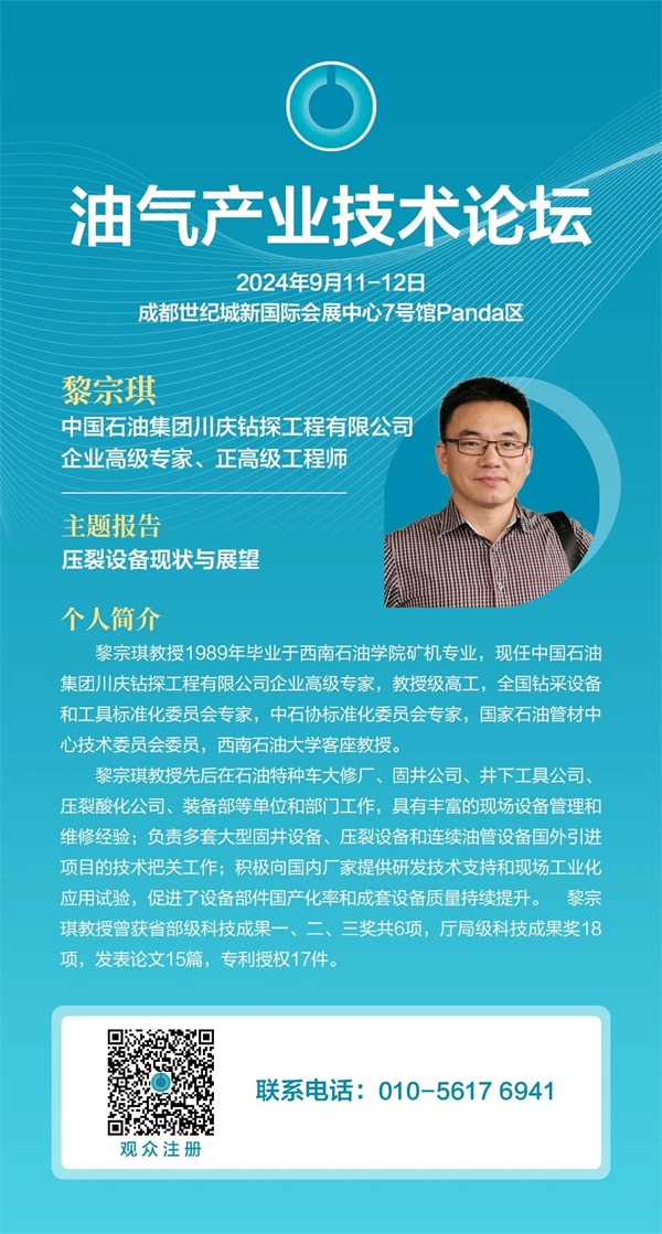 本屆論壇特別邀請到中國石油集團(tuán)川慶鉆探工程有限公司企業(yè)高級專家、正高級工程師黎宗琪出席,并發(fā)表題為《壓裂設(shè)備現(xiàn)狀與展望》主題報告,歡迎業(yè)界同仁準(zhǔn)時參會,與行業(yè)專家一道,共同聚焦我國西南油氣行業(yè)綠色、低碳、高質(zhì)量發(fā)展。