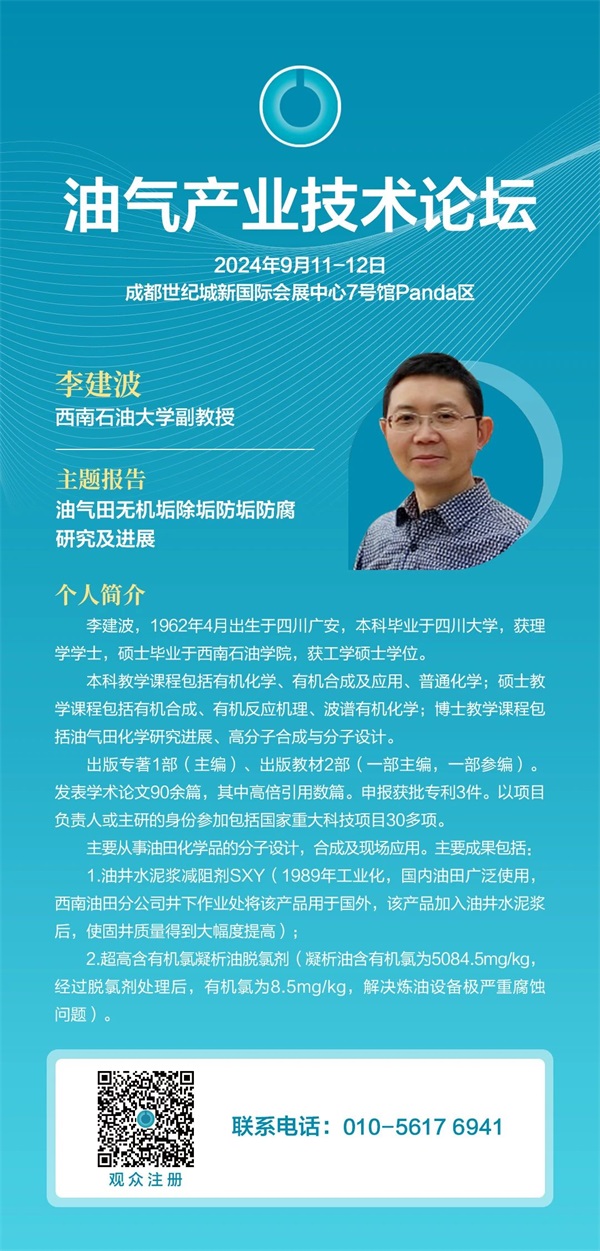 本屆論壇特別邀請到西南石油大學副教授李建波出席,并發表題為《油氣田無機垢除垢防垢防腐研究及進展》主題報告,歡迎業界同仁準時參會,與行業專家一道,共同聚焦我國西南油氣行業綠色、低碳、高質量發展。