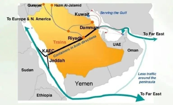 據報道,大陸橋鐵路項目包括7段鐵路改造升級和新建工程。同時,沙特還計劃圍繞大陸橋鐵路沿線布局建設7個物流樞紐中心,分別是:朱拜勒工業城物流中心、達曼陸港物流中心、遷建的利雅得陸港、利雅得國王哈立德機場物流中心、吉達陸港物流中心、阿卜杜勒-阿齊茲國王港物流中心和延布工業城物流中心。