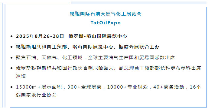 俄羅斯韃靼斯坦共和國已成為中俄地方合作前沿陣地。韃靼國際石油天然氣化工展覽會即將于2025年8月26-28日在韃靼斯坦共和國首府喀山舉辦,展會由韃靼斯坦共和國工貿部、喀山國際展覽中心、振威會展聯合主辦,為石油、天然氣、化工領域裝備技術企業打造絕佳的市場“瞭望塔”和出海“助推器”。