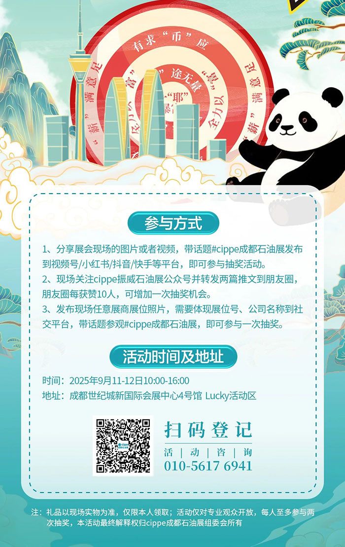 · 線上分享抽獎:拍展會現場圖 / 視頻,帶話題 #cippe 成都石油展 發布到視頻號 / 小紅書 / 抖音 / 快手,直接參與抽獎~