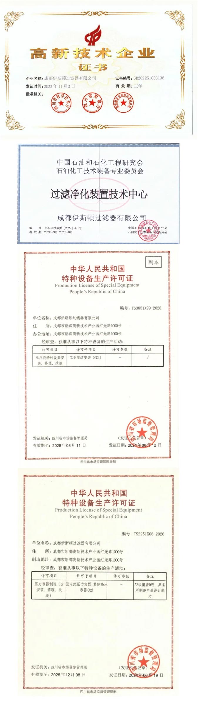 成都伊斯頓過濾器有限公司成立于2009年,是一家集研發(fā)、生產、銷售、服務為一體的專業(yè)從事過濾分離凈化產品的國家級高新技術企業(yè)、四川省專精特新企業(yè),擁有A2級壓力容器制造和設計資質、GC2級管道安裝資質,并被中國石油和石化工程研究會認定為過濾凈化裝置技術中心,2025年公司已申請ASME認證、CNSA實驗室認定。
