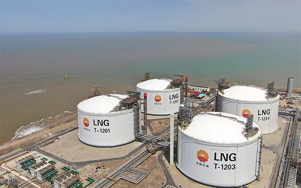 Liquefied natural gas storage tanks at an LNG receiving terminal in Jiangsu province in May. [Photo by Xu Congjun/For China Daily]