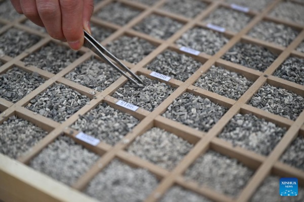 A researcher looks at samples collected from deep earth through a microscope at "Shenditake 1" borehole in the Taklimakan Desert in the Tarim Basin, northwest China's Xinjiang Uygur Autonomous Region, March 3, 2024. The drilling of a superdeep borehole in northwest China's Xinjiang Uygur Autonomous Region reached 10,000 meters at 2:48 p.m. Monday and is going deeper, marking a breakthrough in the country's deep-Earth exploration